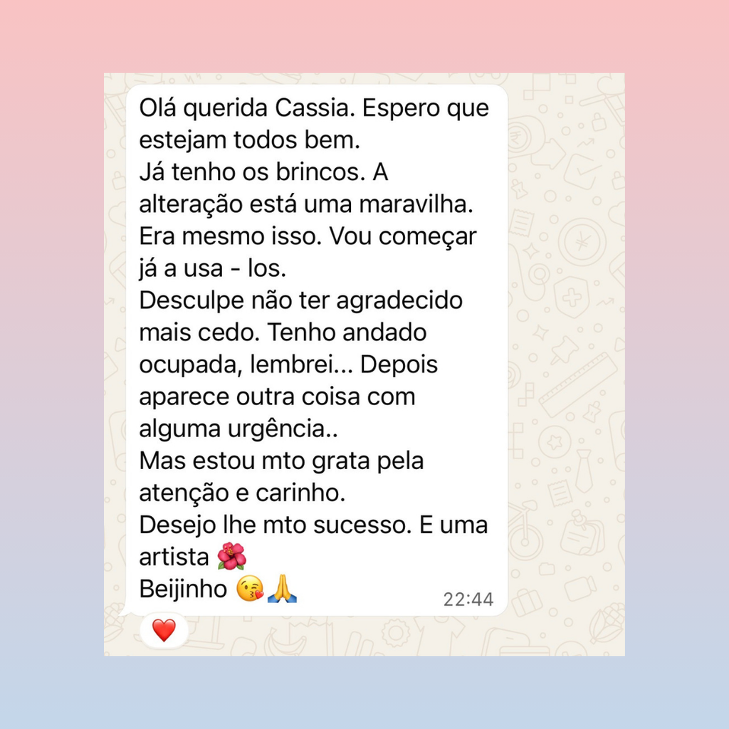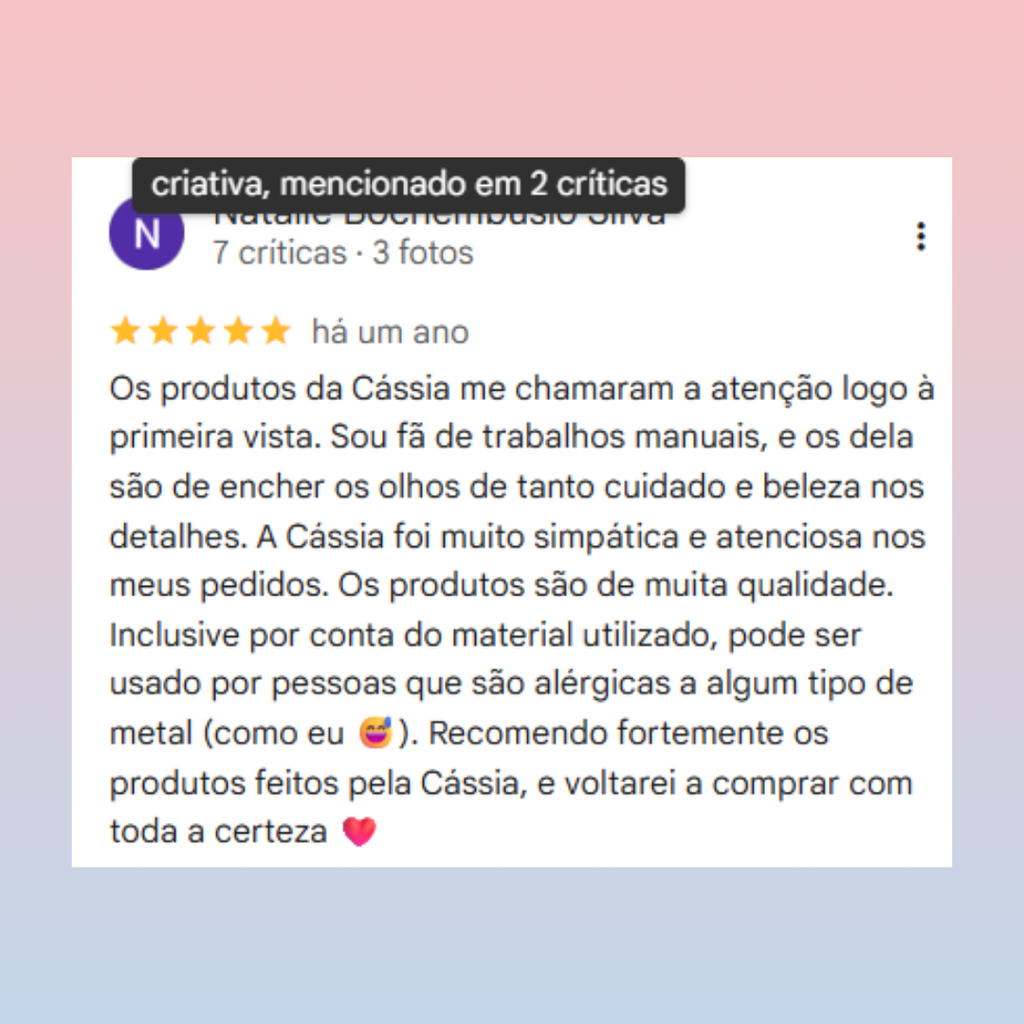 Cada peça conta uma história e recebe o nome de uma música marcante para mim, tornando-a ainda mais especial. Amo explorar novos materiais e surpreender com modelos inusitados, sempre valorizando a personalização para que cada acessório reflita a essência de quem o usa.